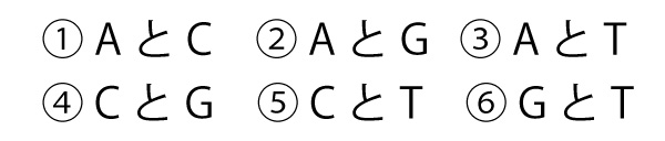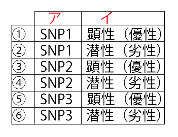 (1)遺伝子RのDNAにおけるセンス鎖(RNA合成の鋳型とならない側のヌクレオチド鎖)では、SNP2は何と何の塩基の多型と考えられるか。最も適当なものを、次ののうちから一つ選べ。(3点)