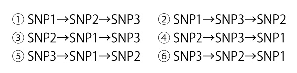 問2 ヒトの近縁種であるチンパンジーの遺伝子Rの延期配列を調べたところ、表1にある人の多型部位と相同な部位は、対立遺伝子PAVと同じ配列であることが分かった。人でSNP1~3を生じさせる突然変異はヒトとチンパンジーの分岐後に起こったとした場合、これらの突然変異が起こった順序として最も適当なものを、次ののうちから一つ選べ。ただし、遺伝子Rの進化の過程で、同じ部位に突然変異が複数回起こることはなく、多型部位の間に組換えはなかったものとする。(4点)