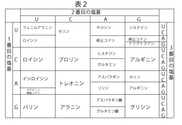 問3 表1のSNP2は、受容体タンパク質の262番目のアミノ酸にアラニンとバリンの違いを生じさせる。表2の遺伝暗号表を参照しながら、次の(1)(2)に答えよ。