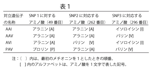 ヒトでは、苦味物質であるフェニルチオカルバミド(以下、PTC)に対する感受性に多様性が存在し、苦味受容体の遺伝子の一つ(以下、遺伝子R)にある遺伝的多型がその原因であることが知られている。人の集団において遺伝子Rの塩基配列を調べたところ、タンパク質のアミノ酸配列を変化させる3か所の一塩基多型(以下、SNP1~3)があり、その組合せとして4種類の対立遺伝子が見つかった。表1は、それぞれの対立遺伝子から合成される受容体タンパク質のアミノ酸配列の違いを示す。ここでは対立遺伝子の名称として、SNP1~3によって変化するアミノ酸の組合せを用いた。