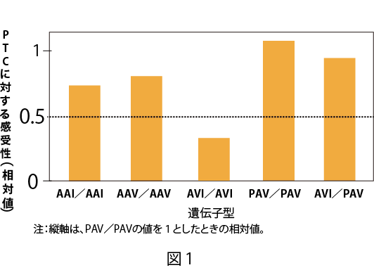 問4 表1にある対立遺伝子をホモ接合で持つ複数個体(それぞれの遺伝子型をAAI/AAI、AAV/AAV、AVI/AVI、PAV/PAVとする)と、対立遺伝子AVIとPAVをへテロ接合で持つ複数個体(AVI/PAVとする)の、PTCに対する感受性を測定した。その結果、それぞれの平均値は図1のようになった。