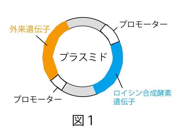 外来遺伝子とロイシン合成遺伝子のそれぞれを、酵母内で働くプロモーターにつなぎ、図1のようにプラスミドを組み込む。変異体Lの集団にこのプラスミドを導入する処理を行った後、それらの細胞を、ロイシンをア培地で培養すると、プラスミドがイ細胞のみが増殖する。これにより、外来遺伝子を持つ変異体Lを選抜することができる。