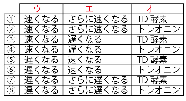 (1)これらの事実から、「植物AのTD酵素」は、幼虫Sの消化管内でトレオニンを分解することで、吸収可能なトレオニンの量を減らし、幼虫Sの成長を抑制する」という仮説を立てた。この仮説を検証するために、TD酵素を合成できない植物Aの変異体(以下、変異体M)を用いた実験を計画し、その結果を予想した。仮説が正しかった場合の結果を予想した次の文章中のウ~オに入る語句の組合せとして最も適当なものを、後の