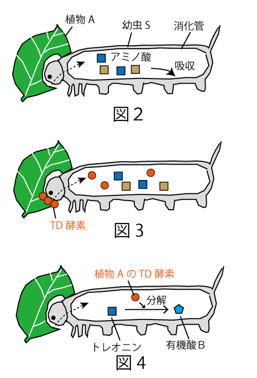 問3 同じく下線部(b)に関連して、あるガの幼虫Sは、植物Aの定義を食べ、そこから体内に吸収したアミノ酸を利用して成長する(図2)。幼虫Sからの食害を感知した植物Aは、直ちに多量のトレオニン脱アミノ酵素(以下、TD酵素)を合成し、それが幼虫Sの消化管に取り込まれる(図3)。TD酵素は、トレオニンを有機酸Bに分解する酵素であり、植物AのTD酵素は、幼虫Sの消化管内でもその触媒作用を発揮できる(図4)。
