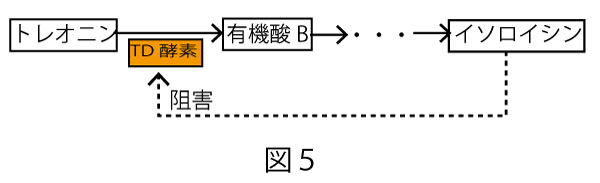 (2)植物AのTD酵素は、植物細胞内でも、トレオニンを有機酸Bに分離する反応を触媒し、トレオニンの分解により生じた有機酸Bは、イソロイシンの合成に使われる。図5に示すように、TD酵素は、アロステリック部位を介して、イソロイシンによる非競争的阻害を受ける。しかし、幼虫Sの消化管内では、植物AのTD酵素は部分的に消化され、触媒作用を保ったまま、アロステリック部位を失う。植物AのTD酵素の活性とその調節に関する記述として最も適当なものを、後の