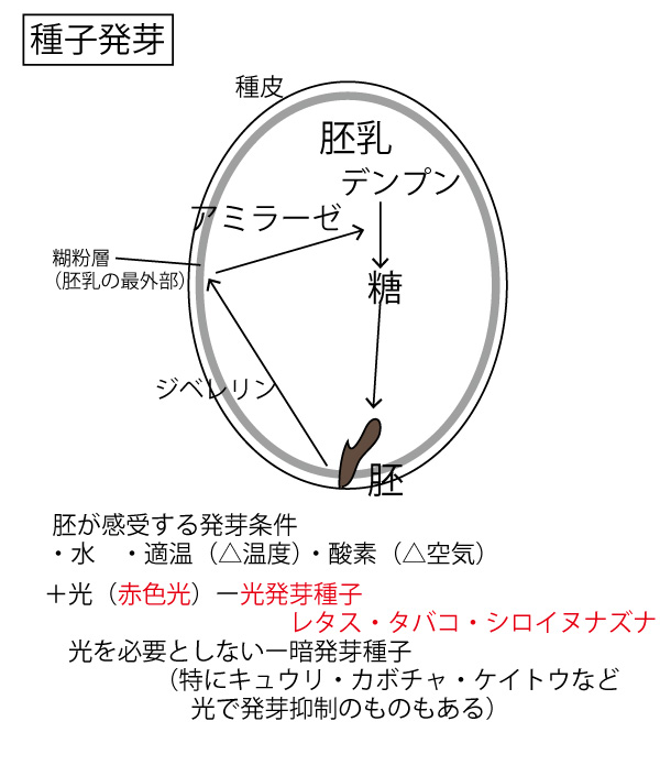 イネの種子では発芽に適した条件になると、種子中のア(胚)でジベレリンが合成されるようになる。合成されたジベレリンは糊粉層(こふんそう)でイ(アミラーゼの合成)を誘導する。その結果、最終的にウ(胚乳)でグルコースが生じ、これをエネルギー源として発芽が始まる。