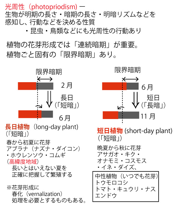 実験上でも、本州型のイネにおいては「長い明期」(「短暗」)では、花芽京成のフロリゲン(花成ホルモン)の合成は少なく、「短い明期」(「長暗」)では、フロリゲンの合成が多いことが確認できる。