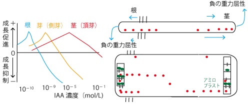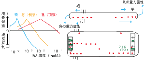 一方、ラッカセイの子房柄を水平にすると、オーキシンの分布が一般的な茎と異なり、下側に比べて上側のオーキシン濃度がキ(高く)なると考えれば、正の重力屈性を説明できる。
