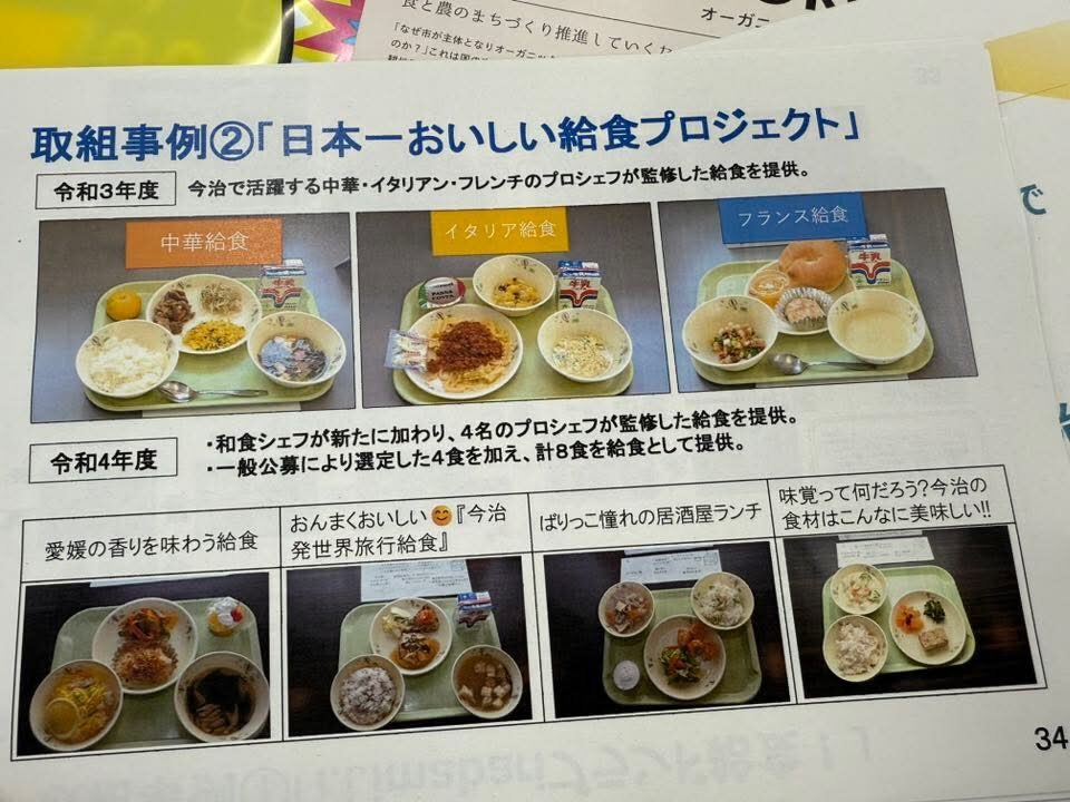 船橋市は児童生徒人口に比べ、農業生産者は多くなく、今治市にように、すべての米飯・パン食を有機農産物にするようなことは困難である。しかし、時々でも使用したり、また従来農法の方も含め、船橋産の農産物をできるだけ学校給食に提供し、生産者がその生産物の生産のご努力を給食時間や授業などで児童・生徒に紹介する取り組みが(少し実施されているが)もっと必要だと思う。また、児童・生徒参加のメニューコンテストは、船橋市の給食でもできるはずなので、教育委員会に提案していきたい。