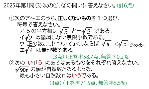 2025年千葉県公立高校入試「数学」第1問(3)(無理数など)問題・解答・解説(計6点) 2026年1月6日 最終更新日時 : 2026年1月6日 asakura FacebookXBlueskyCopy 2026年1月6日(火) 船橋市議(無党派)・予備校講師 朝倉幹晴 2025年2月に行われれた千葉県公立高校入試数学第1問(3)(無理数など、配点6点)の問題・解答・解説を作成しました。普段の学習や2026年2月の千葉県公立高校入試、他県・私立の高校入試対策にお役立てください。なお、千葉県教育委員会が発表した正答率・無答率も付記しました。 問題ページの最後で「2」をクリックすると解答・解説のページに飛びます。 Pages : 1 2