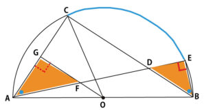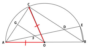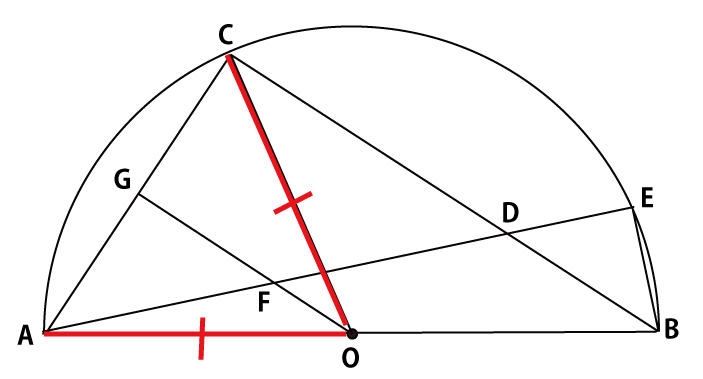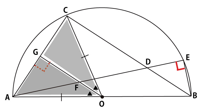 線分OAと線分OC(ア)(a答)は、半円Oの半径(エ)(b答)だから長さが等しい。よって△OCAは二等辺三角形(オ)(c答)である。