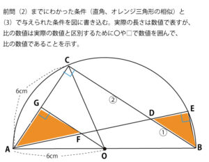 図でオレンジの2つの三角形が相似であることの証明が求められている。