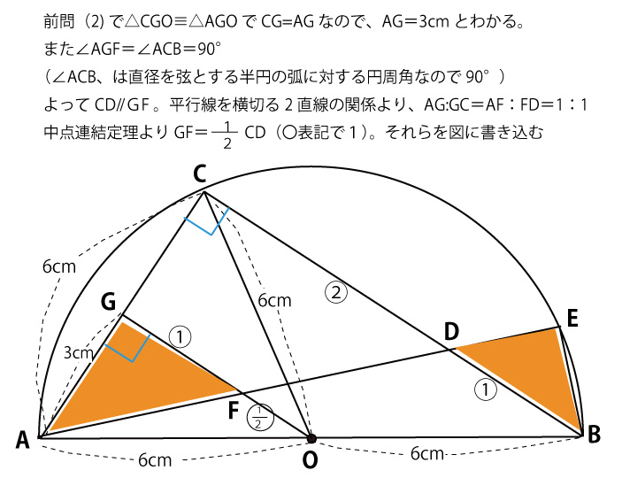 ∠FGAは90°のように見えるが、はっきりと書いていないので、ここを前問(1)から、90°であることを証明する。