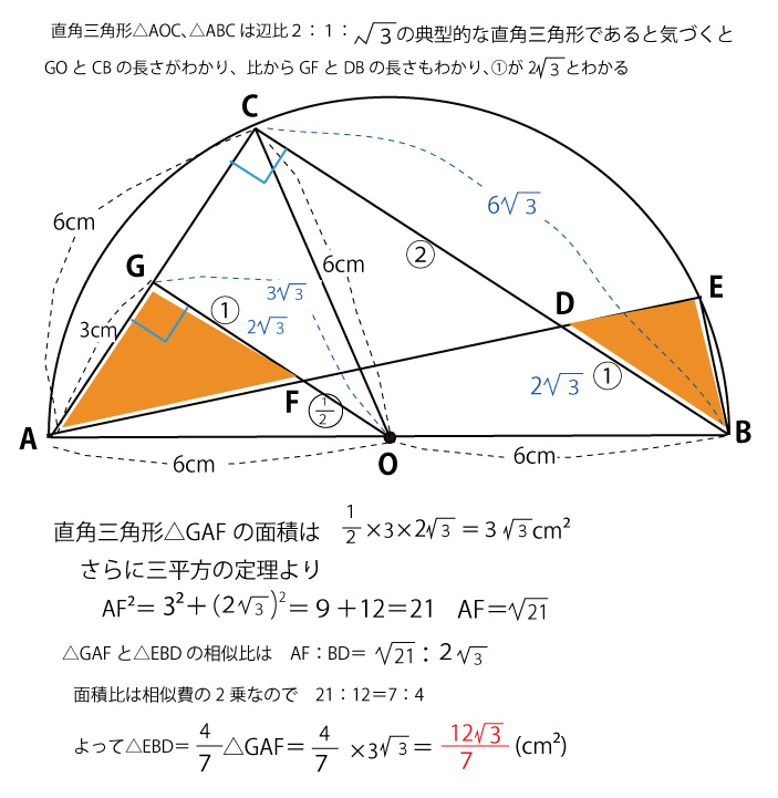 次に直径ABを弦とする半円の弧に対する円周角は90°(タレスの定理)なので、∠DEB=90°
