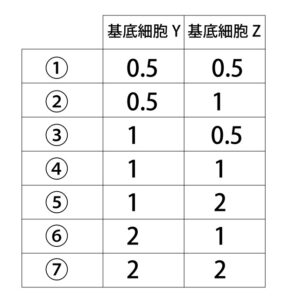 問2 図1に示した各細胞の細胞周期を調べたところ、分泌細胞XはG1期、基底細胞YはG2期、基底細胞ZはM期の中期にあることがわかった。分泌細胞Xに含まれるDNA量を1とした場合、基底細胞Yおよび基底細胞Zに含まれるDNA量の組合せとして最も適当なものを、次の