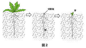 B タンポポは再生力が強く、植物体を引き抜いても、地中に根が残っていると、図2に示すように、その(1)根の切断端近くの細胞が増殖して新しく芽をつくり、やがて地上部を再生する。再生したタンポポは、種子から育ったタンポポと同様に、花を咲かせ、次世代を残す。