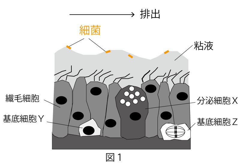 A 気管の表面は、働きの異なる複数の細胞からできている(図1)。分泌細胞は粘液を分泌し、(a)繊毛細胞にある繊毛は粘液を喉の方向に排出するための運動を行う。これらの細胞は基底細胞から分化する。(b)細菌などの異物は、粘液により捉えられ、繊毛の運動により排出される。繊毛の内部には、繊毛の運動をつかさどるタンパク質Aがあり、(c)これに異常が起こると、異物の排除が正常に行われなくなる。