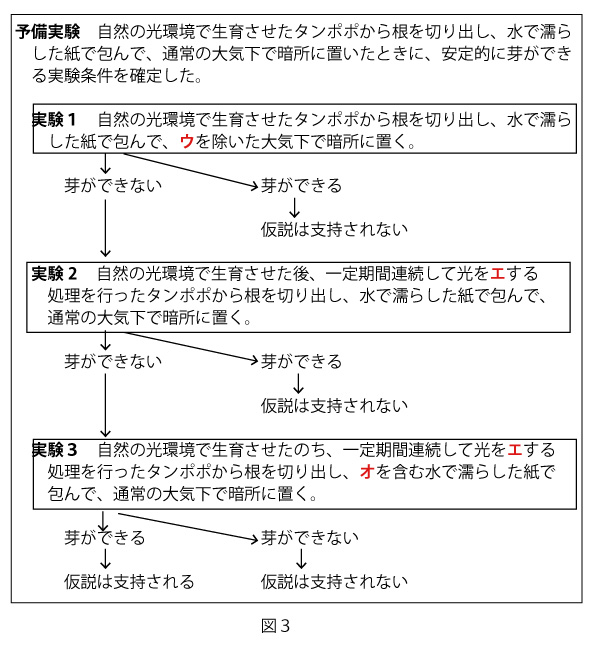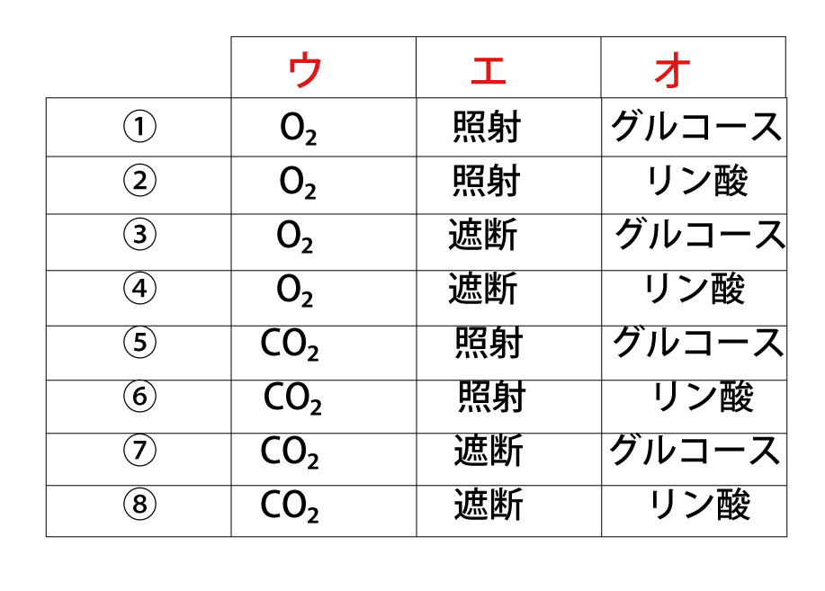 問5 同じく下線部(d)に関連して、新しく芽をつくるにはエネルギーが必要とされるはずである。このエネルギーについて、「根は葉の光合成で生産された有機物を蓄えており、この有機物から呼吸によって取り出したエネルギーを使って芽をつくる」という仮説を立てた。図3は、この仮説を検証するために計画した一連の実験を示している。図3中のウ~オに入る語句の組合せとして最も適当なものを、次の