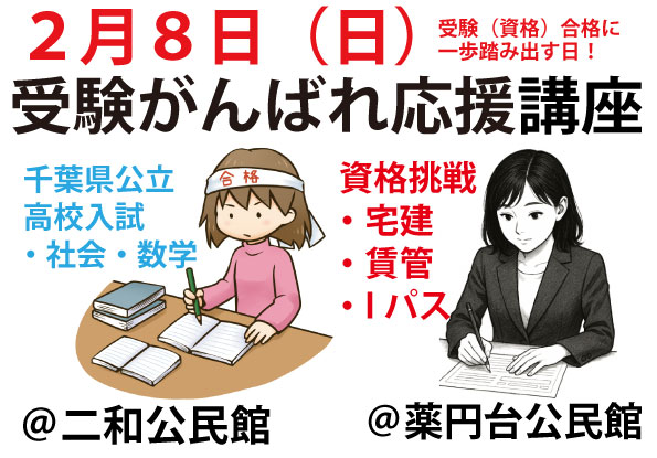 2月8日(日)受験がんばれ応援講座~高校入試(日本史・数学)対策講座&国家資格3資格(宅建・賃貸不動産経営管理士・ITパスポート)受験アドバイス&相談会~