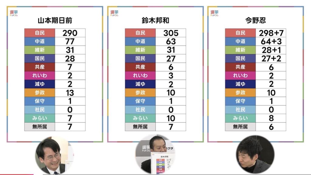 しかしながら、このような経過を経ても高市首相の支持率は(少し減少したが)高い状況を維持し続けており、「選挙どっとコム」での識者の選挙予測も以下のようになっている。