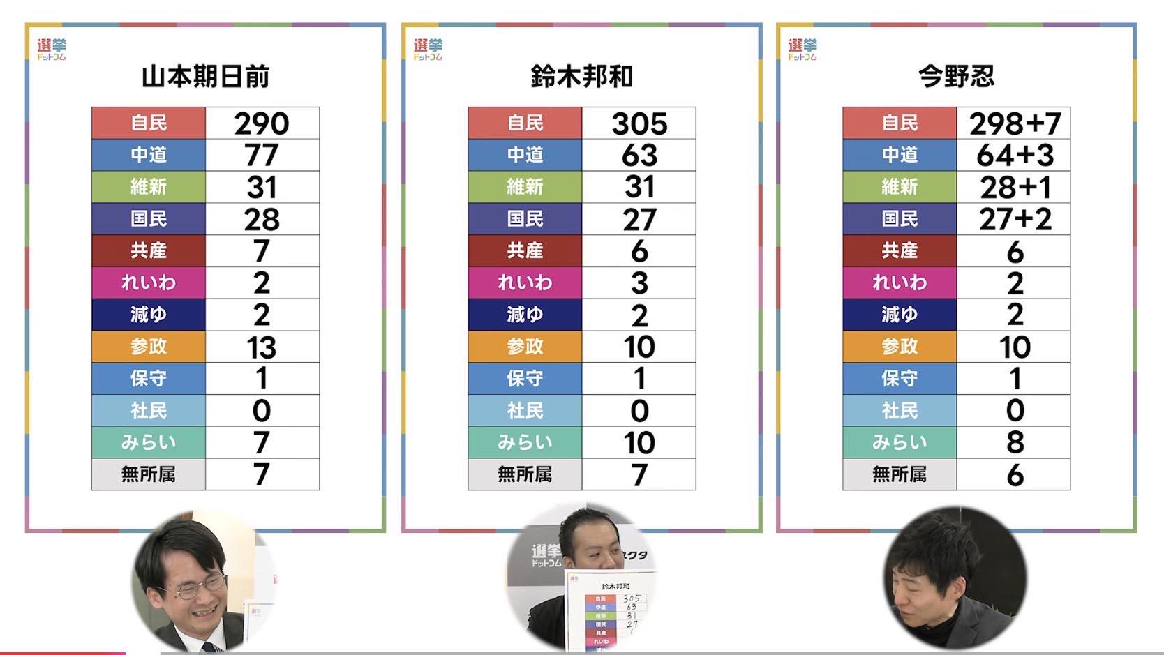 識者3人の分析は微妙な差はあれ、与党(自民・維新)で2/3を超える310議席を超えると予測されている。